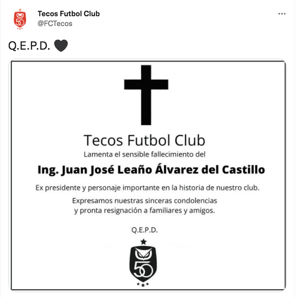 Tecos Futbol Club, de la Liga Premier y que renaciera con el nombre y los colores que tuvo en el inicio de su historia, pero lejos de la continuidad de aquel equipo, recordó a Juan José Leaño este viernes tras su muerte, así como la Femexfut.
