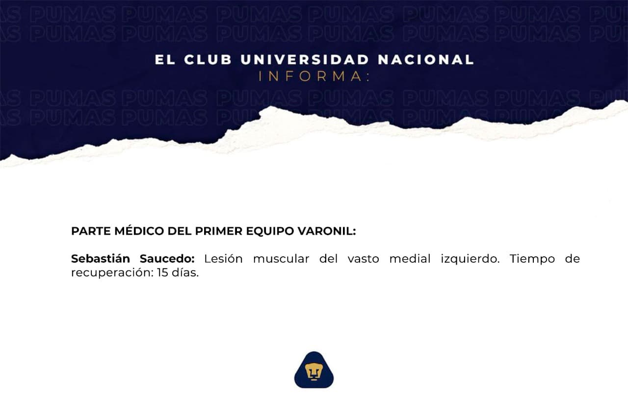 Sebastián Saucedo, extremo de Pumas, es baja por las próximas dos semanas debido a una lesión muscular del vasto medial izquierdo, infirmó el conjunto universitario este sábado minutos antes del partido pendiente ante Mazatlán de la Jornada 9.