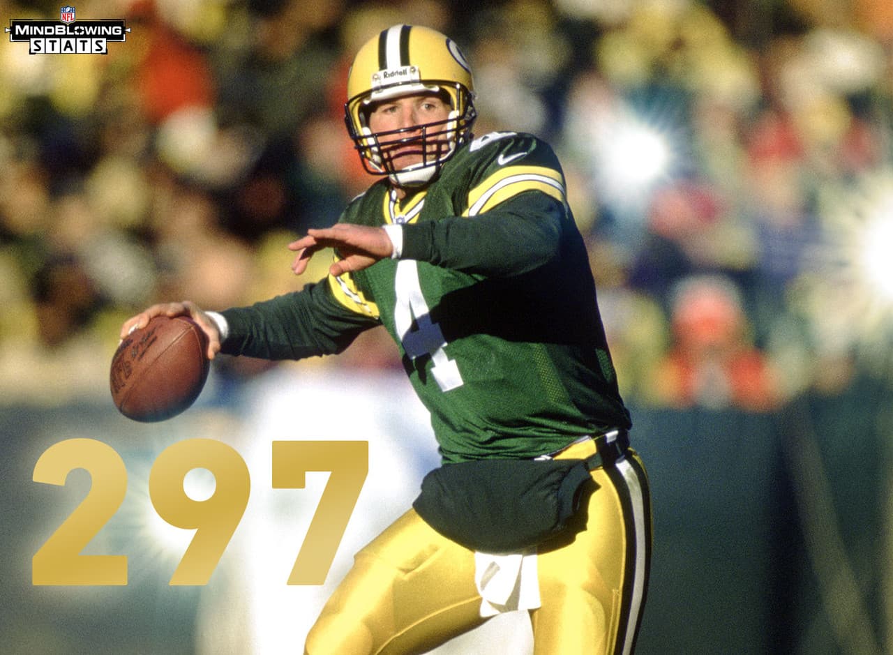 Brett Favre es el líder de todos los tiempos en aperturas como titular para un quarterback con 297 registradas en el periodo de 1992 a 2010. Su total supera por 89 aperturas a lo que hizo Peyton Manning, segundo en la historia. Esas 89 aperturas de Favre equivalen a los 5 años y medio de carrera que Brett tuvo por encima de Peyton. Durante las 297 aperturas de Favre un total de 237 otros quarterbacks tuvieron su primer inicio en la NFL.