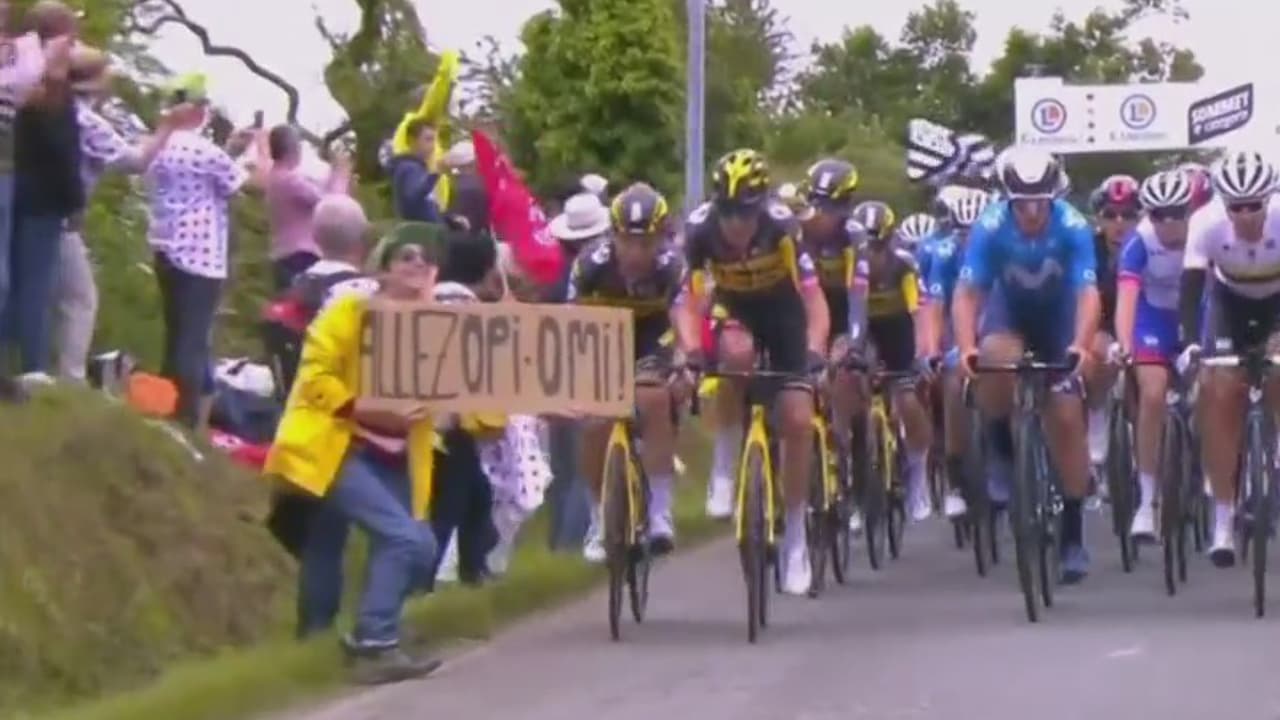 Vestida con un impermeable amarillo, la aficionada mostraba una pancarta en alemán en un cartón al paso del pelotón y fue arrollada por el germano Toni Martin, que se fue a tierra y arrastró a varios otros ciclistas en una enorme montonera a 45 kilómetros de a meta de Landerneau.