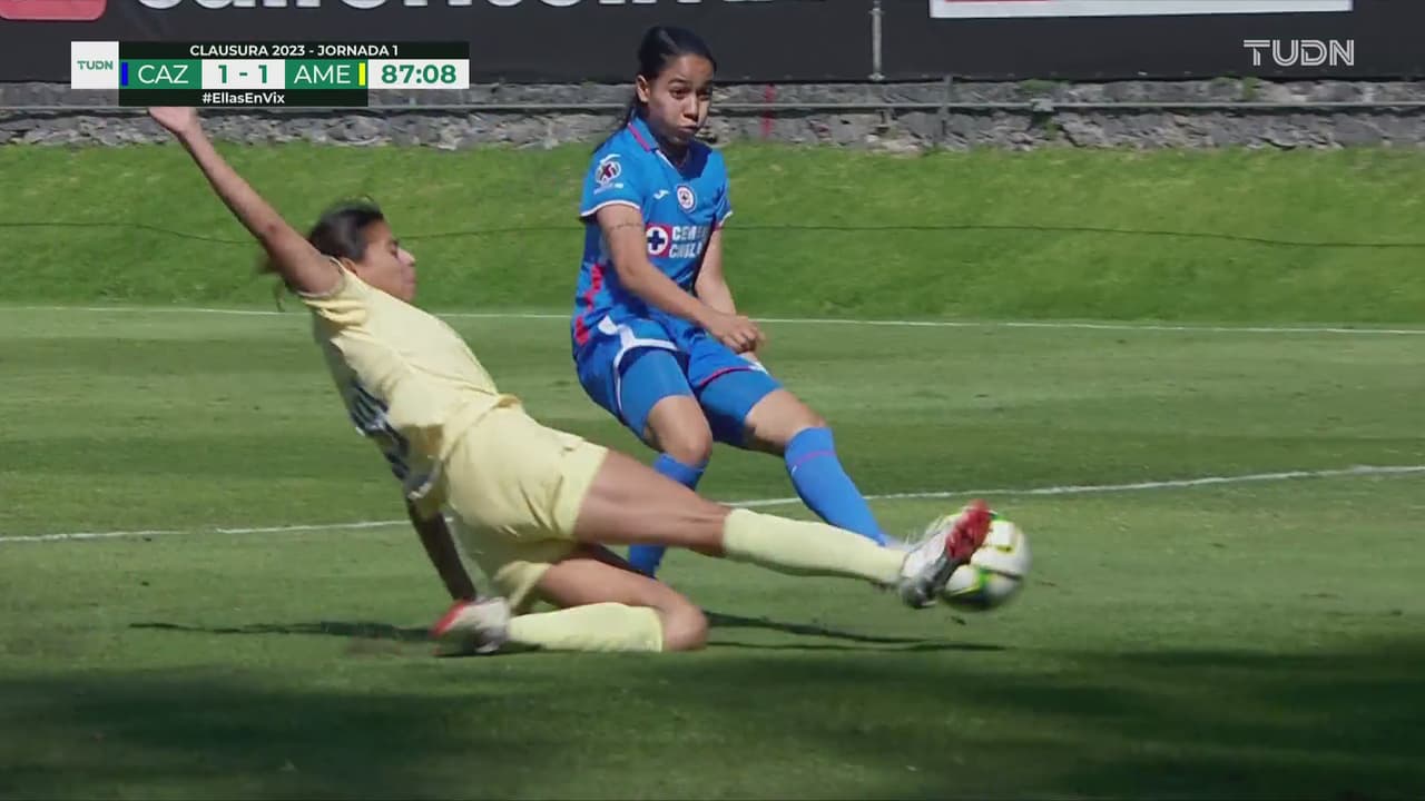 Le filtran el balón a Ximena Ríos y estaba sola, pero Amanda llega a tiempo para tapar su remate.