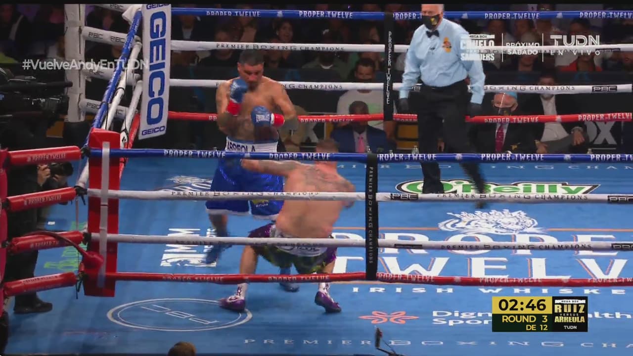 La campana abrió el tercer rollo en una pelea que despertó a la ‘Pesadilla’ Arreola, que se puso en una guardia que avanzó y atacó y conectó para sacudir a Ruiz. El intercambio de golpes se empezó a igualar y para los últimos segundos, Ruiz quiso llegar con mucha fuerza, pero la campaña le impidió continuar el castigo que Arreola presumía no era suficiente.
