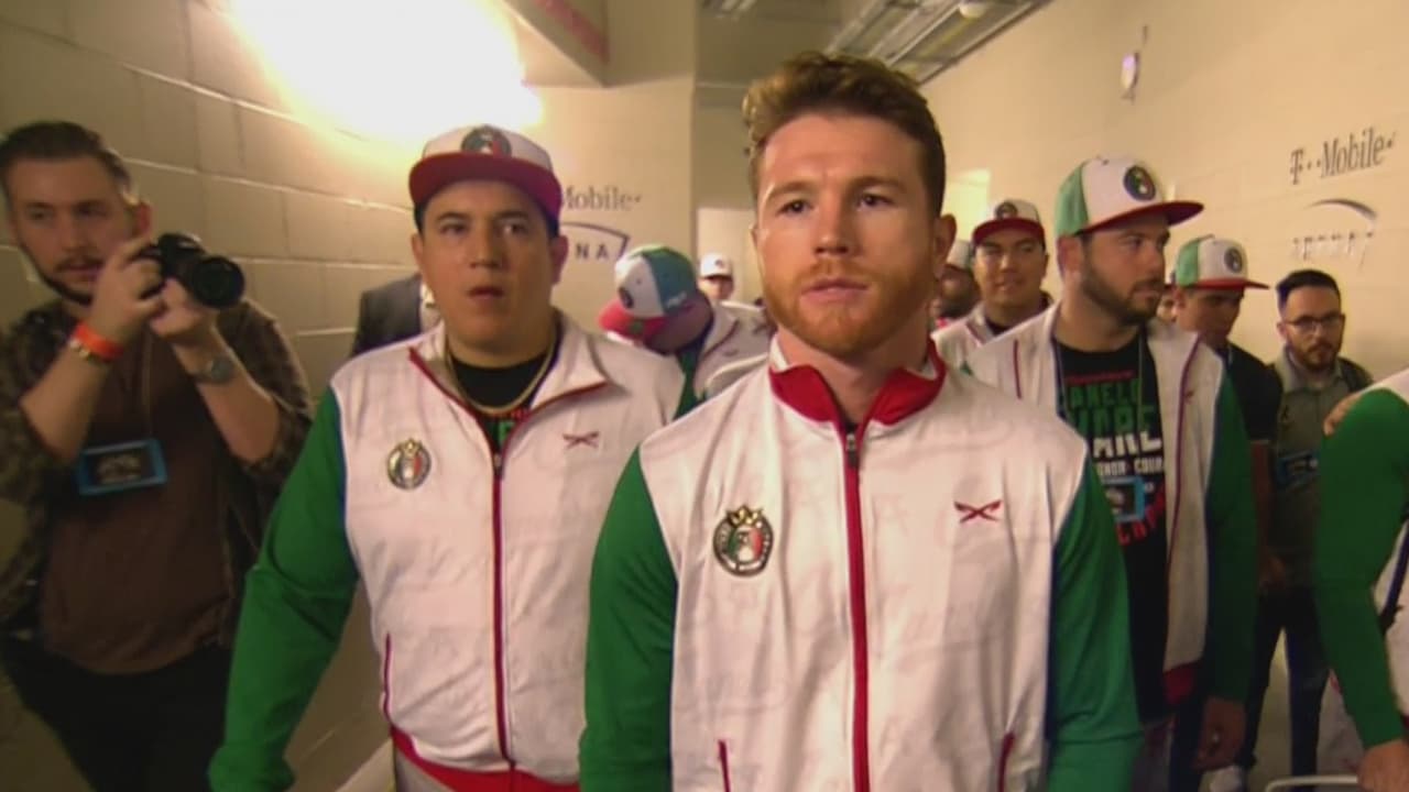 El boxeador mexicano arribó al T-Mobile para presentarse ante la báscula, de cara a la pelea de revancha de este sábado frente a Gennady Golovkin.