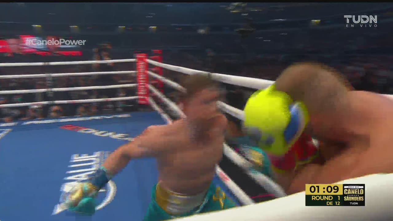 Los gritos de los aficionados retumbaron cuando la mano derecha de Saúl entró de lleno en la cara de Saunders que se cimbró y retrocedió.