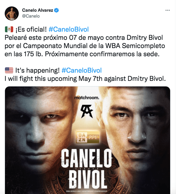 Saúl ‘Canelo’ Álvarez confirmó que peleará frente al ruso Dmitry Bivol el próximo 7 de mayo en busca del título de peso semicompleto en las 175 libras, luego de dar la noticia junto al cartel de la pelea a través de sus redes sociales.