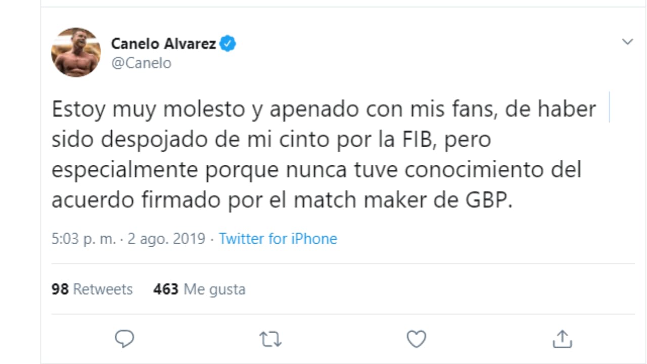 El púgil mexicano Saúl “Canelo” Álvarez publicó en Twitter su reacción tras habérsele retirado el cinturón de la Federación Internacional de Boxeo por temas de escritorio.