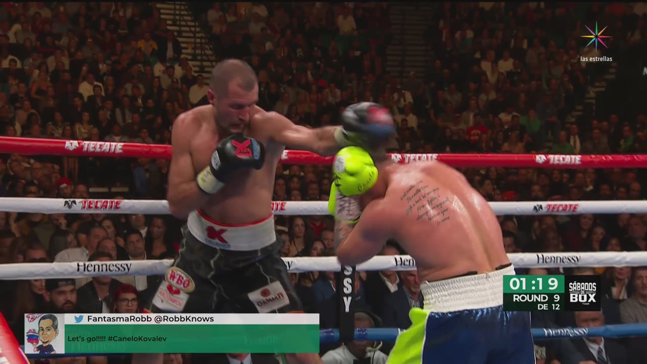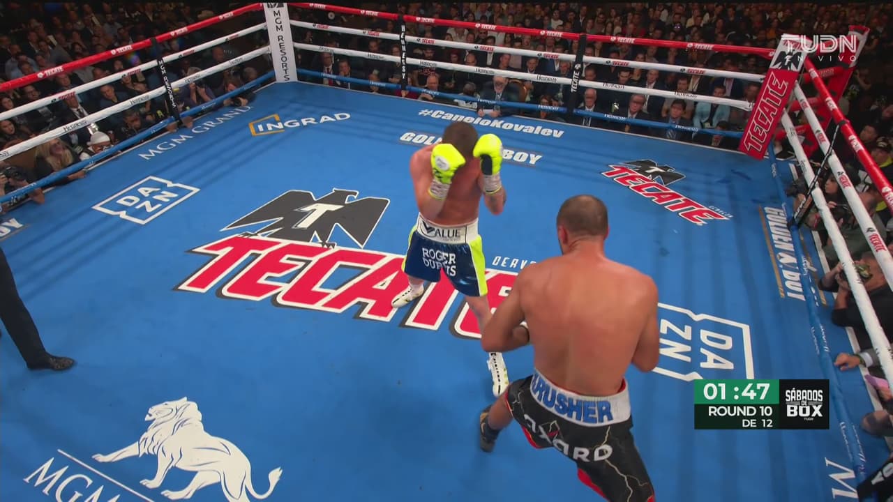 El décimo finalmente Canelo logró encerrar a su contrincante, metió incluso un gancho al hígado que le dio presencia y que dio un mínimo intercambio que era bien aprovechado por 'Kova' y si compás que no permitía que Álvarez lo conectara como esperaba.