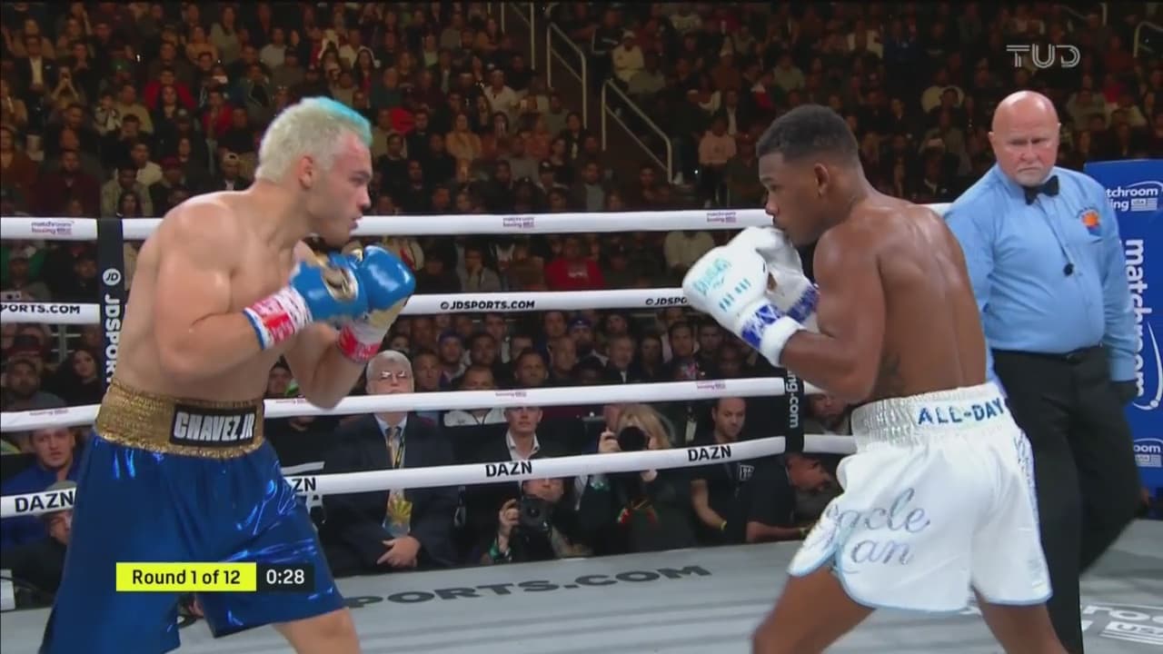 En el primer round Chávez se vio más ofensivo, trató de cerrar los espacios ante un Jacobs que aguardaba para sacar un contragolpe, Jr. proponía el ataque de forma sorprendente aunque también recibía castigo.