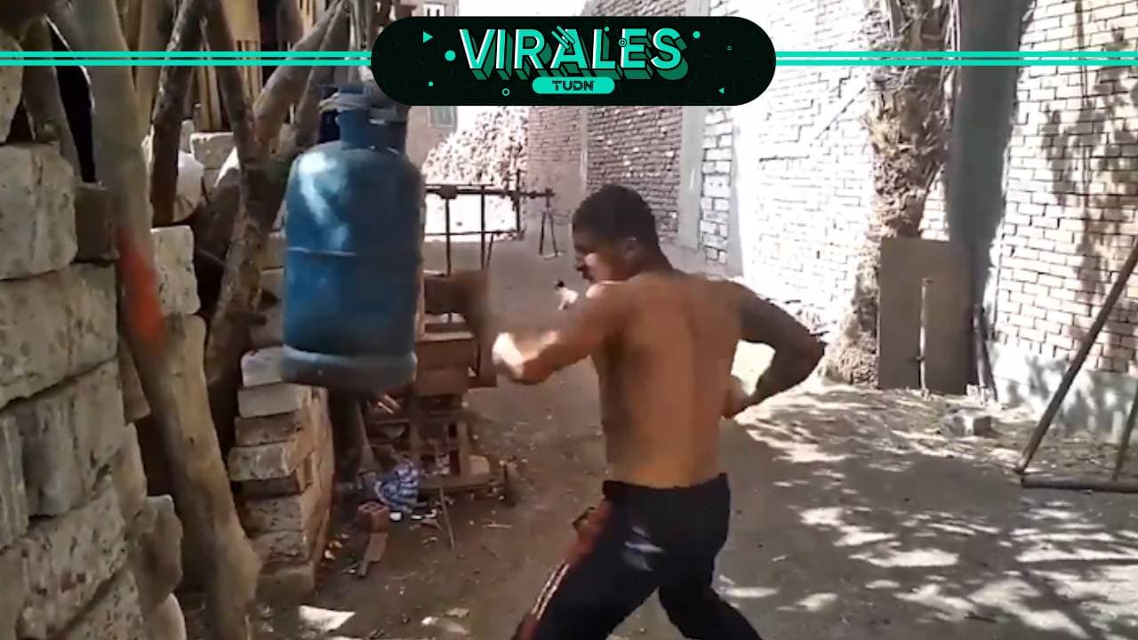 Este hombre sorprende al agarrar de costal un tanque de metal.