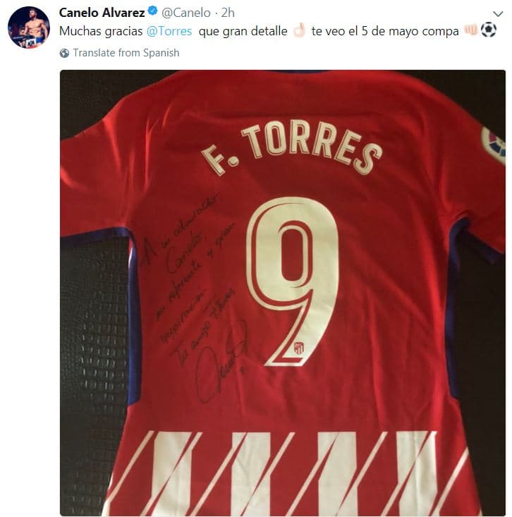 A través de su cuenta de Twitter, Canelo le agradeció al goleador colchonero por el obsequió, y subió una fotografía del jersey que dice “A mi admirable Canelo un referente y una gran inspiración, tu amigo Fernando Torres”.