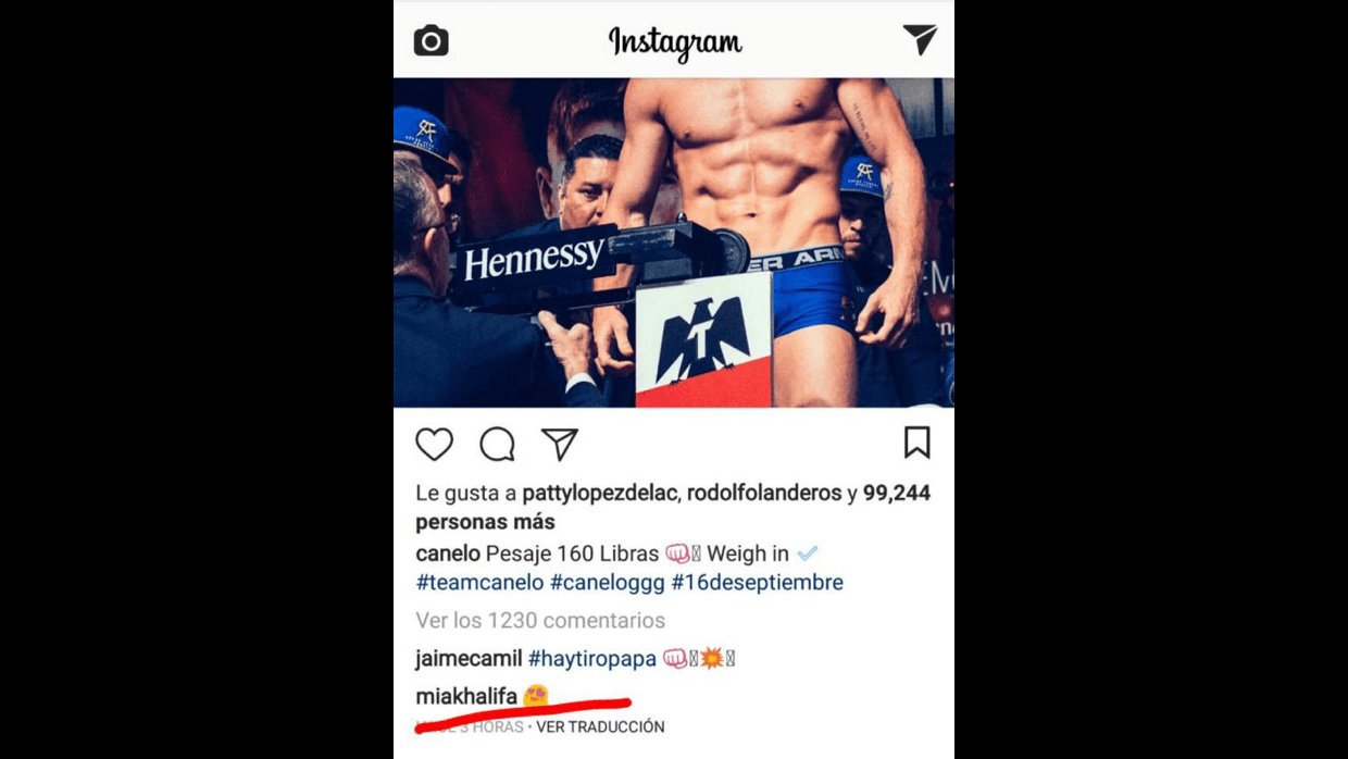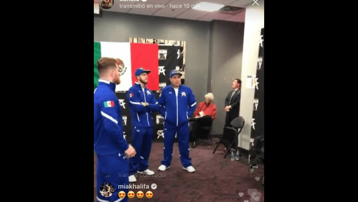 Previo al combate ante el kazajo Golovkin, el ‘Canelo’ comenzó en su cuenta de Instagram una transmisión en vivo de su calentamiento antes de subir al cuadrilátero, algo que Mia Khalifa aprovechó para mandarle un emoji con ojos de corazón en cuanto apareció el tapatío.