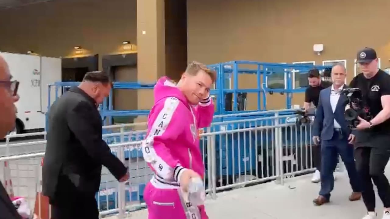 Vestido de rosa mexicano el campeón mexicano arriba para su pelea contra Dmitry Bivol.