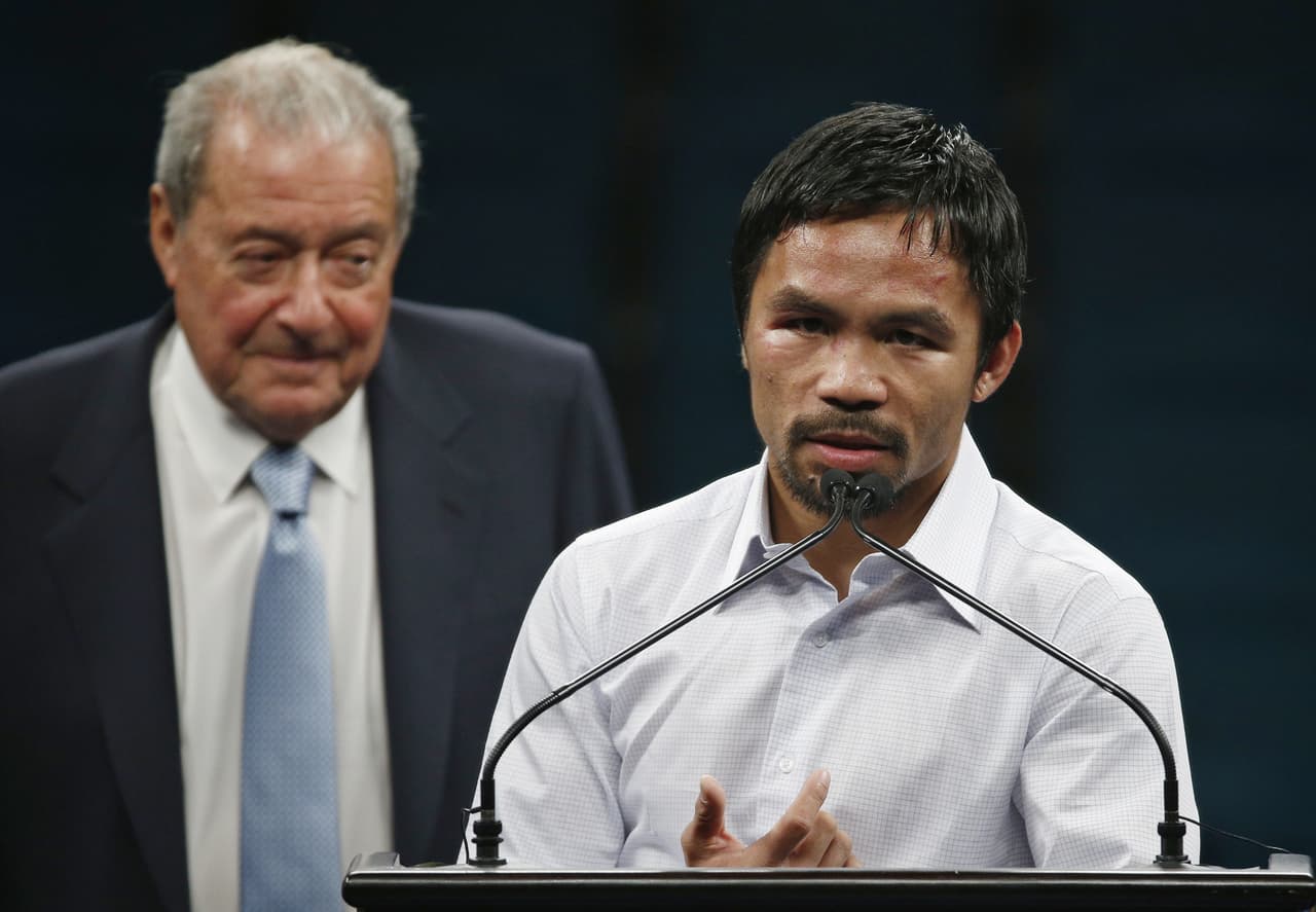 “Respeto mucho a Bob Arum, es como un padre para mí. Creo que está preocupado por mí y lo agradezco, no lo tomo de manera negativa”, declaró Pacquiao.
