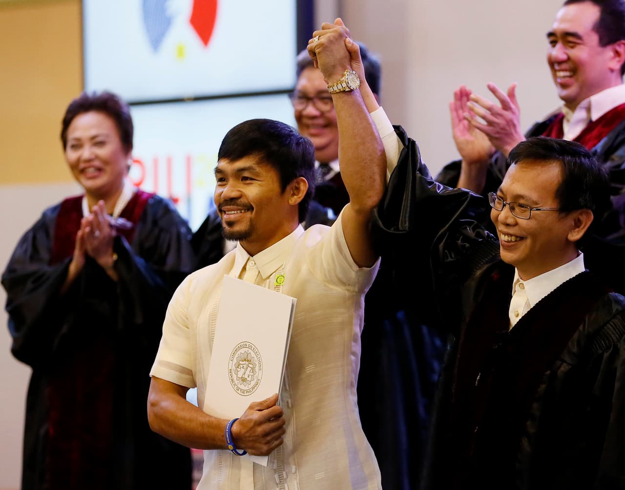 En la ceremonia de asunción, un funcionario electoral presentó a Pacquiao como el "campeón del pueblo" y pronunció su nombre con la misma cadencia con la que es presentado en un ring de boxeo, lo que provocó los vítores del público.