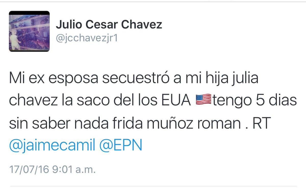 Julio César Chávez Jr. denunció en Twitter que su hija había sido secuestrada por su ex esposa, Frida Muñoz Román, luego de un pleito familiar.