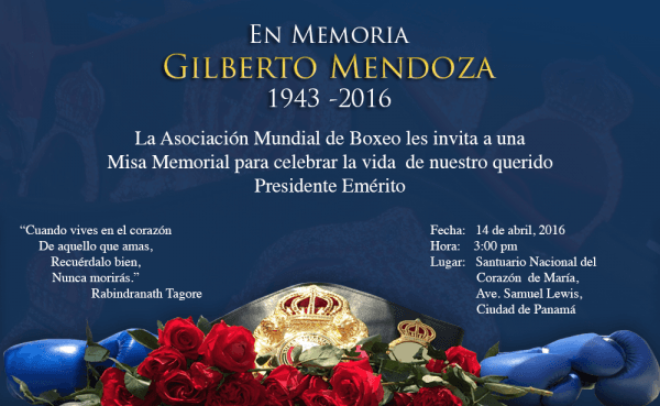 La Asociación Mundial de Boxeo desea invitarlo a una Misa Memorial para celebrar la vida de don Gilberto Mendoza, presidente emérito de la AMB, que se realizará el jueves 14 de abril de 2016 a las 3:00 PM en el Santuario Nacional del Corazón de María de Ciudad de Panamá.