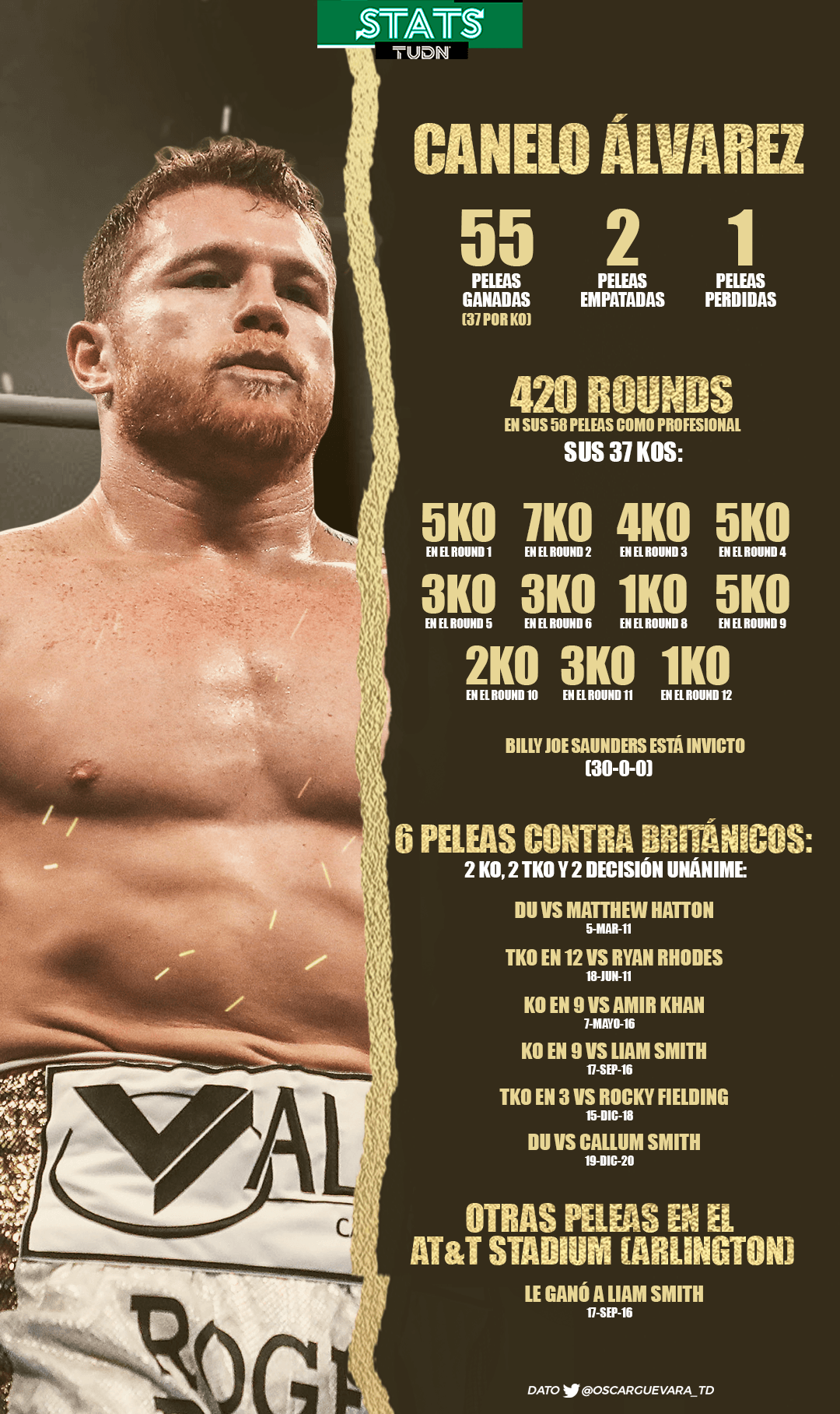 'Canelo' acumula 55 victorias en su carrera (37 ko's), dos empates y una derrota. Saunders está invicto y tiene 30 triunfos en 30 peleas, 14 de ellas por la vía rápida.