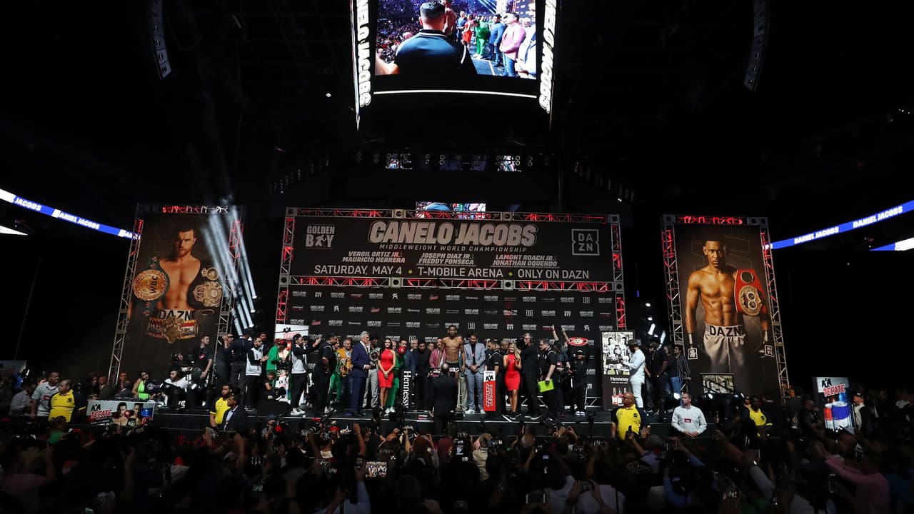 Canelo y Jacobs no sólo se encararon en la ceremonia de pesajes, sino que también llegaron a los empujones y casi adelantan la pelea este viernes en la T-Mobile Arena. (editado)