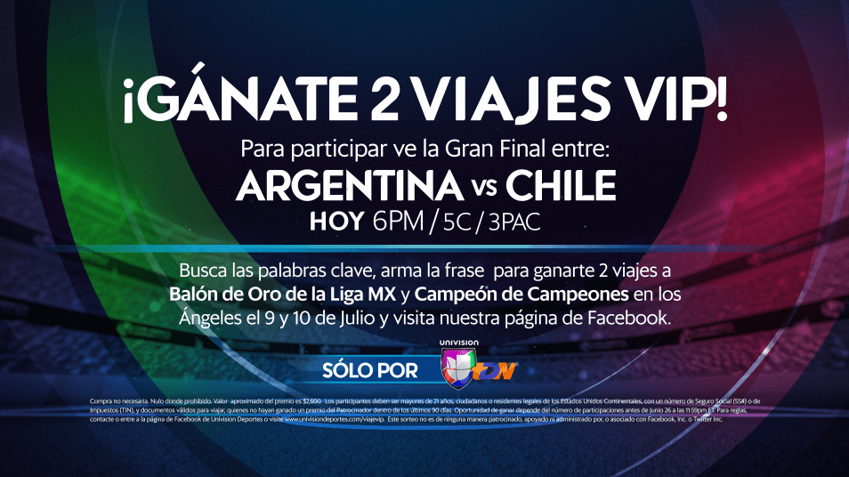 6. Manera de participar: Sintonice a Univision Deportes Network (UDN) durante el partido de COPA AMERICA CENTENARIO, ARGENTINA vs CHILE, el domingo 26 de junio entre 7:00 y 11:00 PM/ET para obtener las palabras clave para armar LA FRASE DEL DÍA. Después Visite; la página de Facebook de Univision Deportes, hazle clic en “Like” a dicha página, y publica LA FRASE DEL DÍA; o, Visite la página de Twitter de @UNIVISIONSPORTS, y envíe un Tweet LA FRASE DEL DÍA con el Hashtag “#UDsorteo” a @UNIVISIONSPORTS, use la función de Twitter “@Reply. Su participación debe ser posteada antes del DOMINGO 26 de JUNIO A LAS 11:59PM/ET.