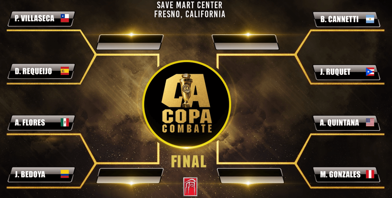 LOS ANGELES.- Combate Américas anunció esta semana dos cambios en la alineación para el evento más grande del año, Copa Combate --torneo de una noche, donde pelearán ocho hombres en peso pluma, por un gran premio de 100 mil dólares-- así como los enfrentamientos oficiales para el evento que se realizará el próximo viernes 7 de diciembre desde el Save Mart Center.