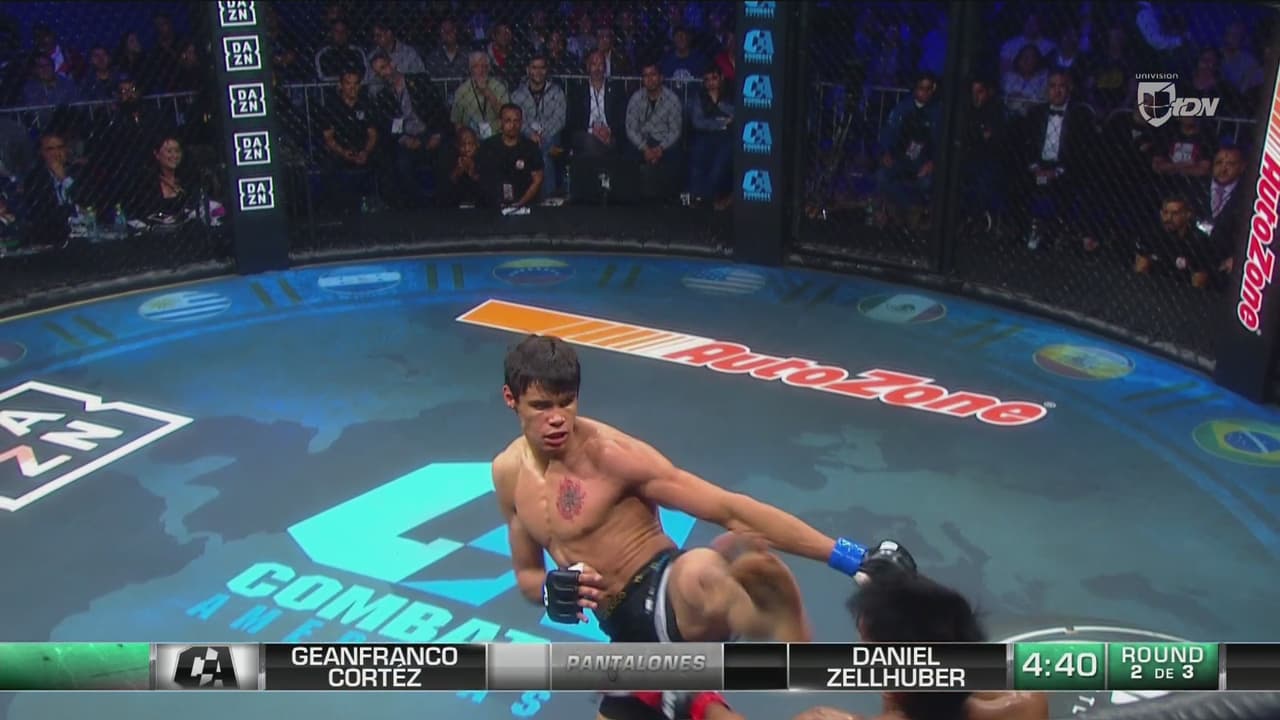 Patada elevada de Zellhuber sobre Cortez que termina con una voltereta