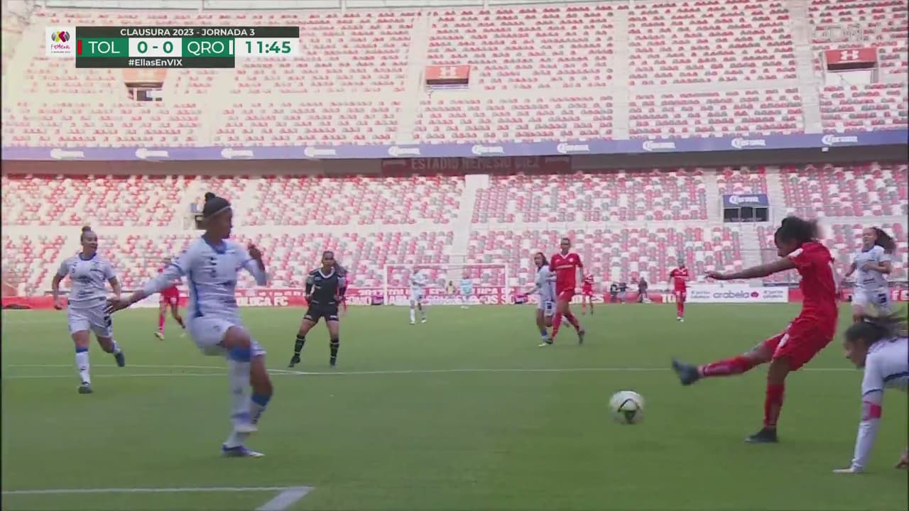 La brasileña se perfiló a la zona del Querétaro buscando sorprender, pero la guardameta Alemany lo impidió.
