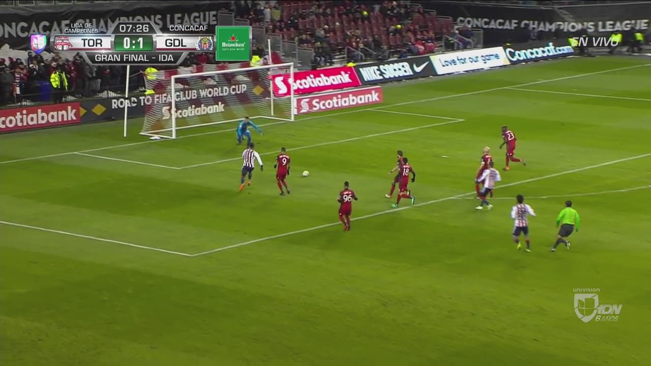 El Toronto FC luce dormido y se equivocó en defensa, Godínez robó, cedió para Pineda pero este filtró para un Alan Pulido en fuera de lugar.