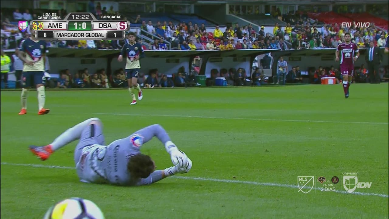 El capitán del Saprissa remató de pierna derecha para hacer estirar al arquero Oscar Jiménez, que vio cómo el balón se fue muy cerca de su palo.