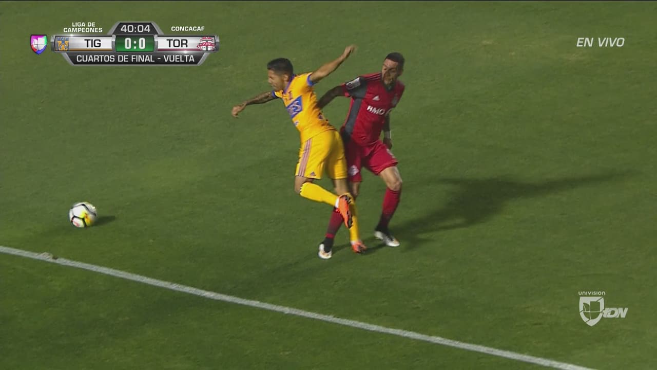 Van der Wiel quiso despejar pero en su lugar se encontró al volante de los Tigres, quien cayó en el área pero el árbitro no marcó.