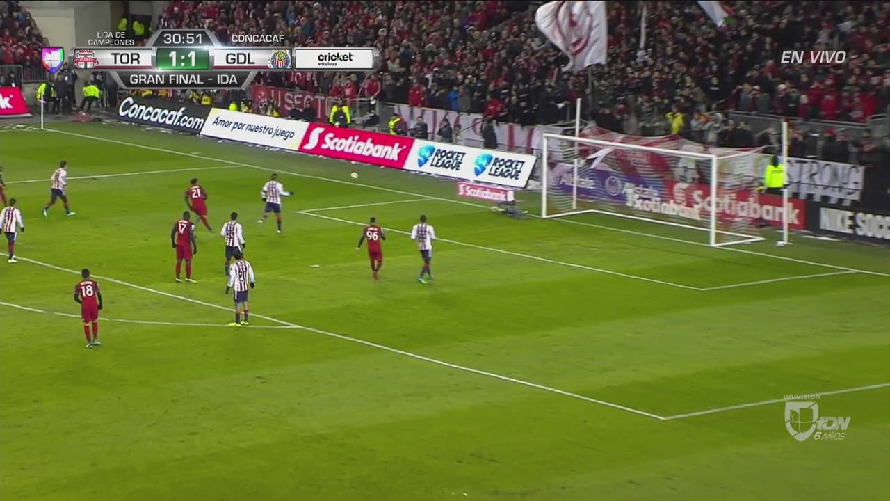 El portero de Chivas se tuvo que aplicar para rechazar el remate colocado del italiano del Toronto.