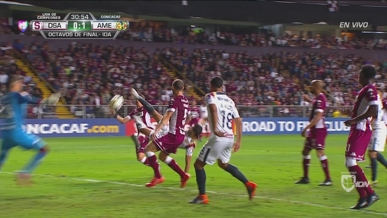 El delantero del América recibió la pelota en el área, pero el balón le botó mal y se tiró una 'tijera' que por poco termina en una gran anotación.