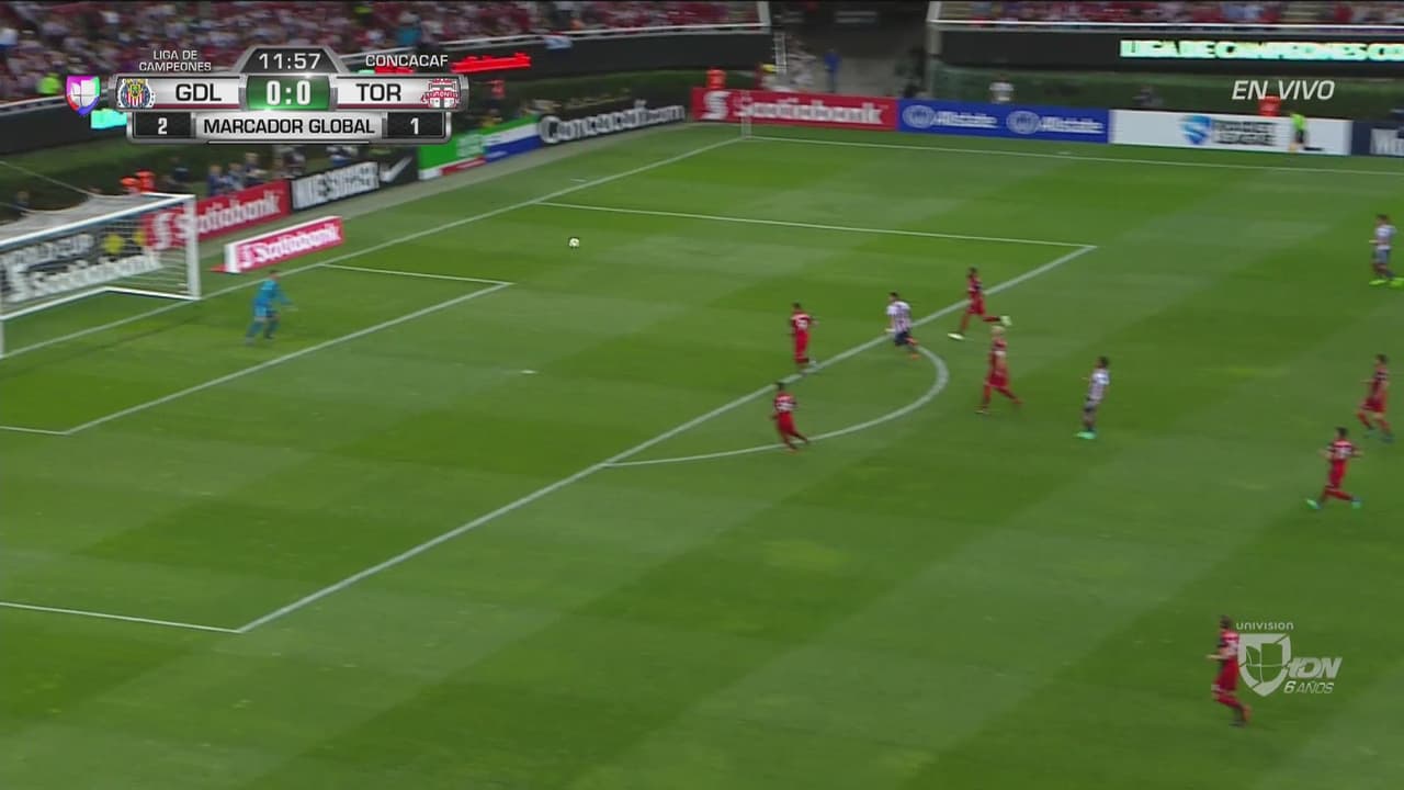 El creativo del Guadalajara trató de superar por arriba al arquero del Toronto que estaba listo para contener el remate de larga distancia.