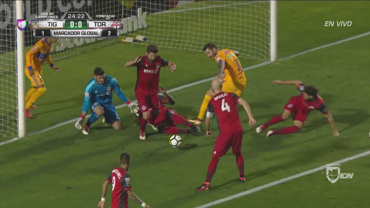 Gran jugada individual de André-Pierre Gignac por el costa izquierdo, centró a Zelarayán, pero la defensa tapó en el último momento.