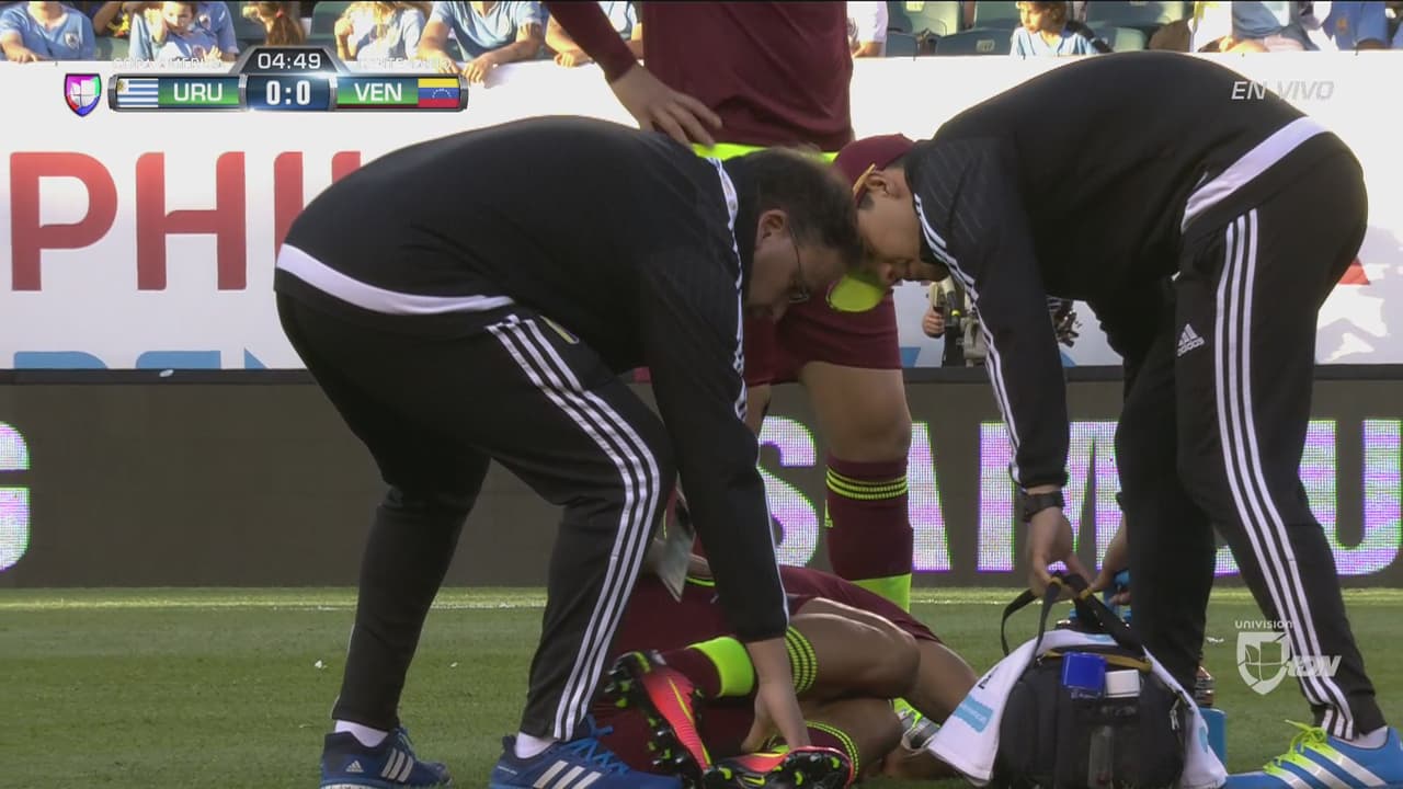 El uruguayo Alvaro González hace una dura entrada que deja lesionado al venezolano Roberto Rosales que tiene que ser sustituido.