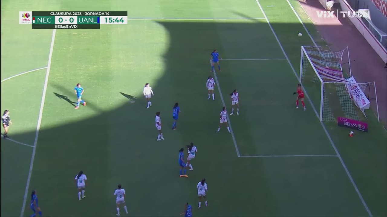 La delantera de Tigres no lo piensa dos veces y saca disparo que se va por arriba de la portería al 16’.