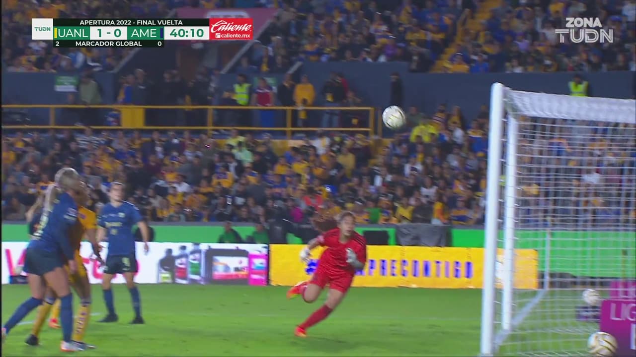 La jugadora del América ganó en el salto y metió un testarazo cruzado que estuvo cerca de clavarse al 40’.