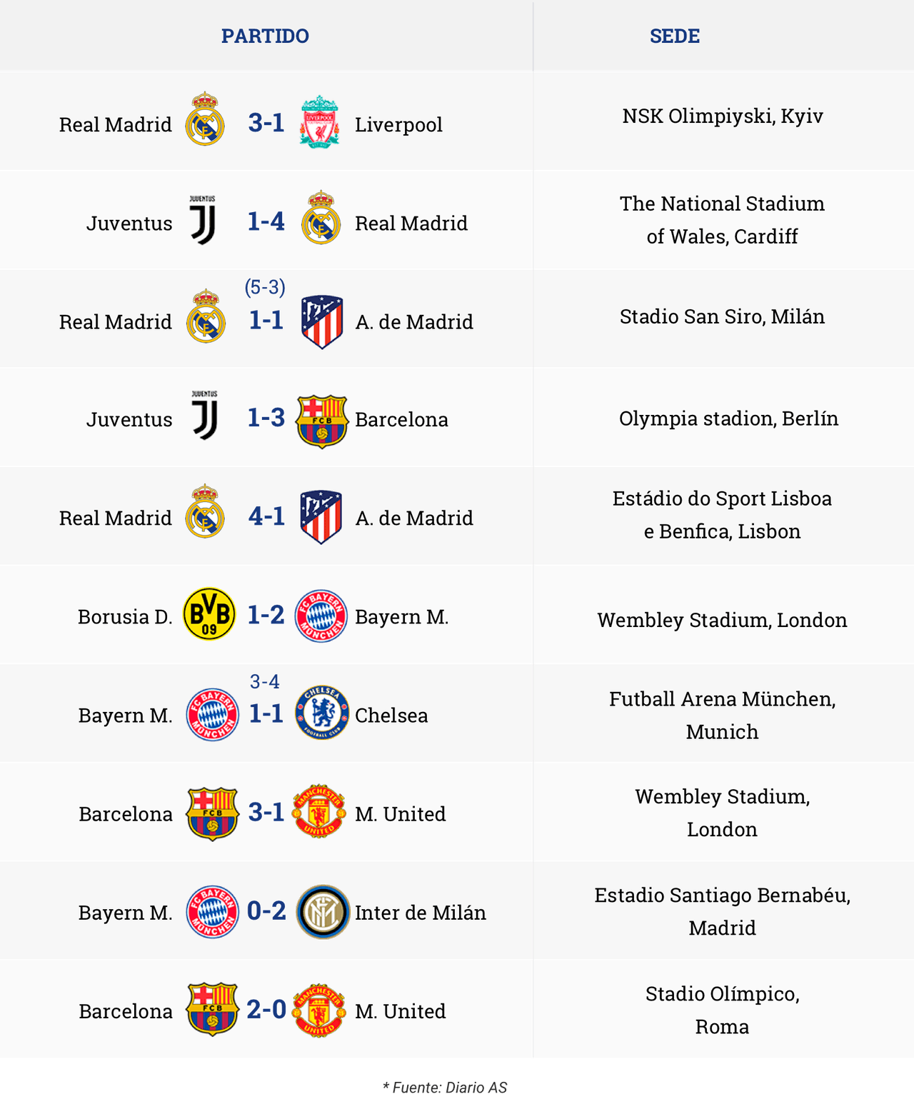 En cuestión individual es igual. La Juventus, considerado otro equipo poderosos, no logró dar el 'do de pecho' en las últimas dos ediciones al caer ante el Real Madrid en la final y semifinal de los torneos 2016-2017 y 2017-2018 respectivamente.