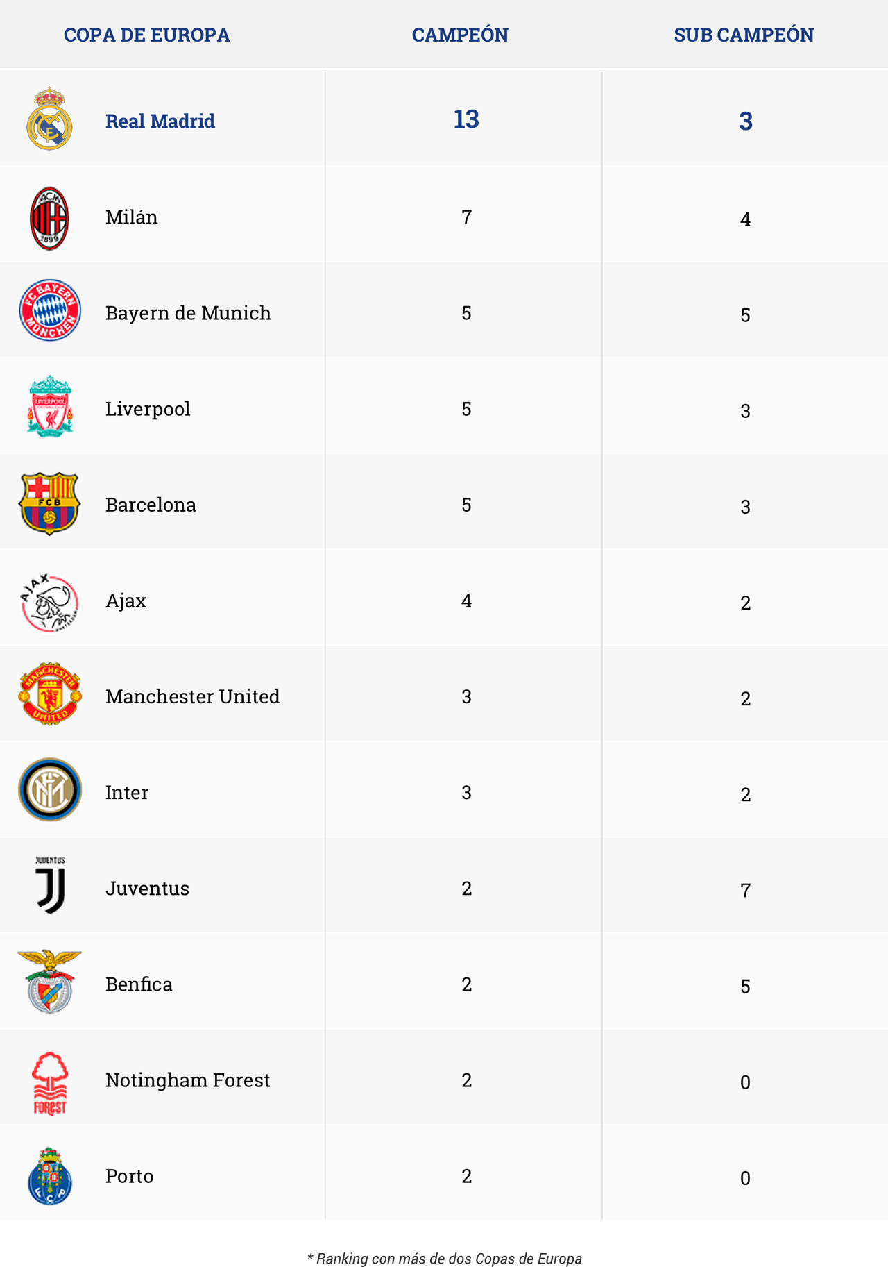 El Real Madrid manda en Europa. Desde la antigua Copa de Europa, en donde sólo jugaban campeones de Liga, hasta la ampliación de la actual UEFA Champions League, son 13 los títulos que decoran sus vitrinas. Y pudieron ser 16, pero el Real Madrid perdió tres finales en los años 61, 64 y 81. Con todo, se trata del equipo más laureado en cuanto a Copas de Europa se refiere. Es más, casi doblan en número al segundo, el Milán, siete veces campeón.