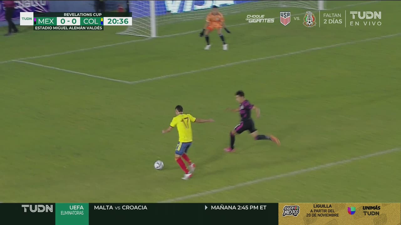 Llegada a velocidad por el costado izquierdo, el colombiano saca un cañonazo y el poste también interviene.