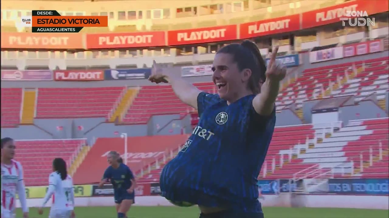 La defensora española de América anotó ante Necaxa y lo celebró como embarazada, "por si nace (mi hijo) y ya no juego futbol".