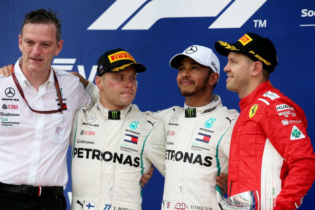 El alemán Sebastian Vettel (Ferrari), que está ya a 50 puntos de Hamilton en la clasificación de pilotos, acompañó en el podio a los dos Mercedes.