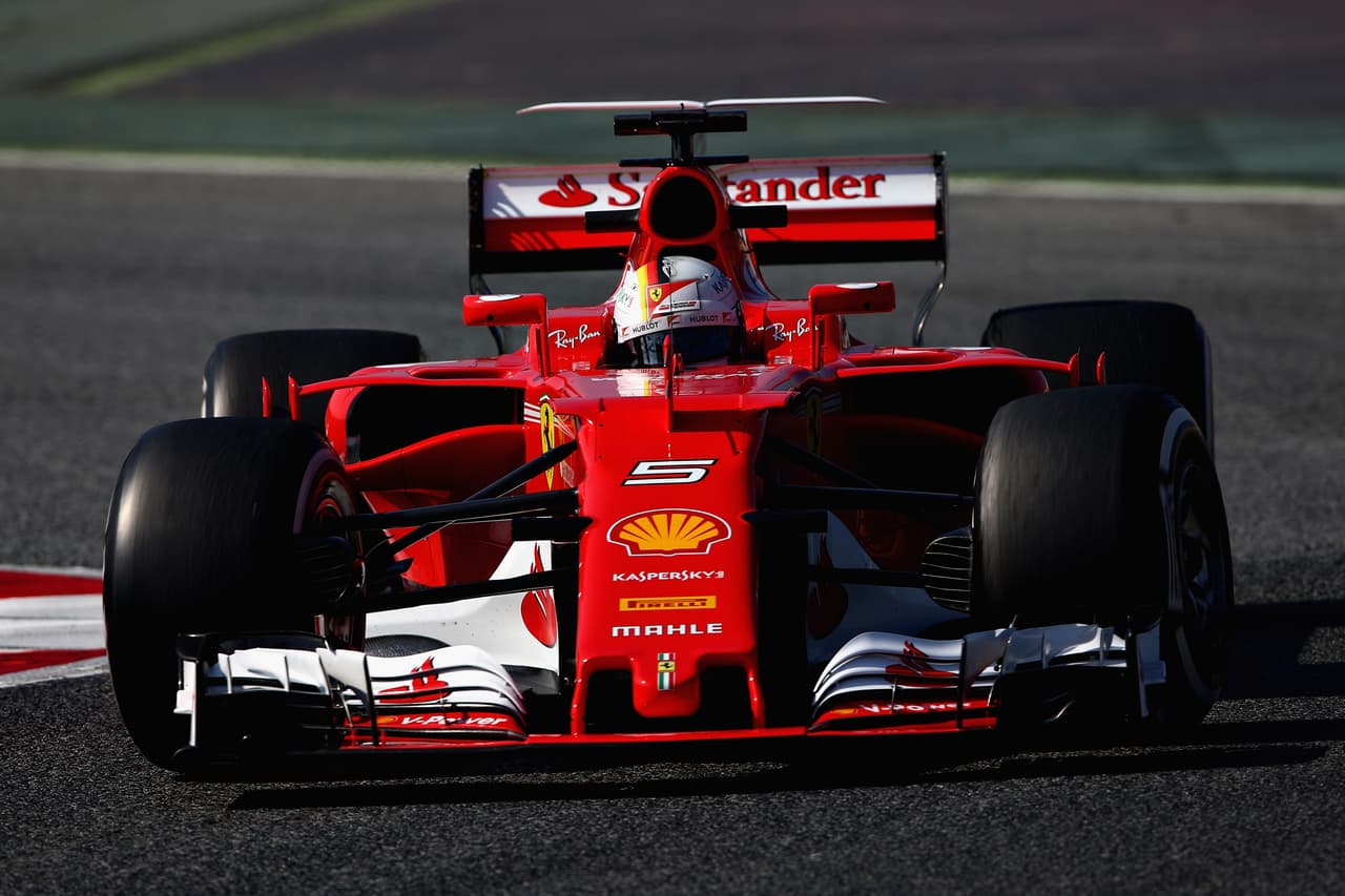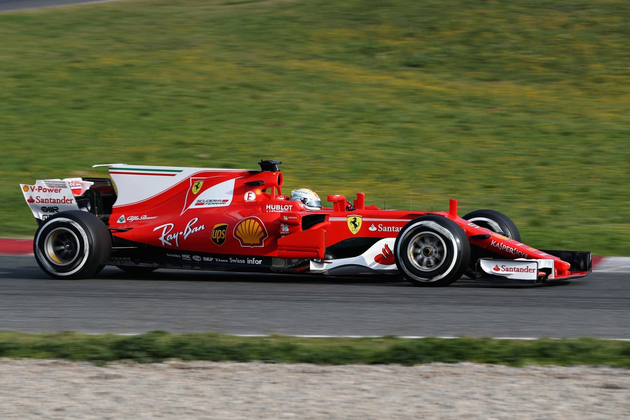 El Ferrari SF70H en los primeros giros de la pretemporada en el circuito de Cataluña. Kimmi Raikkonen y Sebastian Vettel serán los pilotos.
