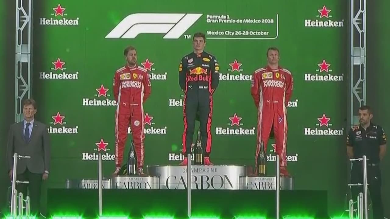 Max Verstappen, Sebastian Vettel y Kimi Räikkönen subieron al podio en el Autódromo Hermanos Rodríguez e izaron las banderas de Holanda, Alemania y Finlandia.