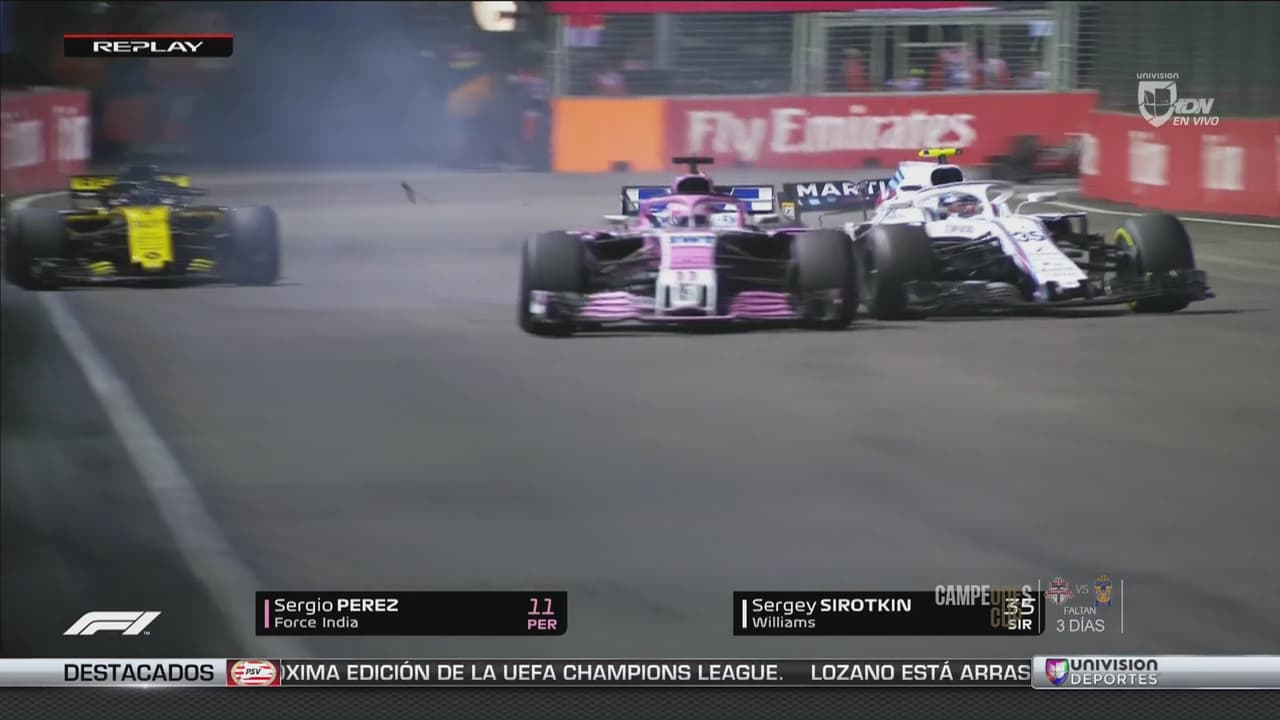 ¡La sacó barata! ‘Checo’ Pérez recibió sanción por chocar a Sirotkin en el GP de Singapur
