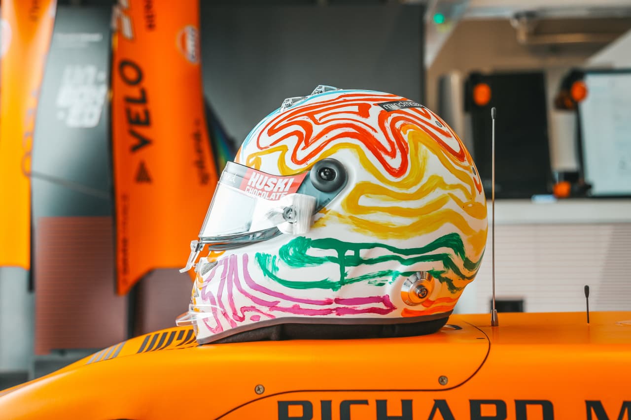 Los cascos dan vida a los diseños creados por Lando y Carlos durante su desafío de pintura de cascos para Mind en agosto