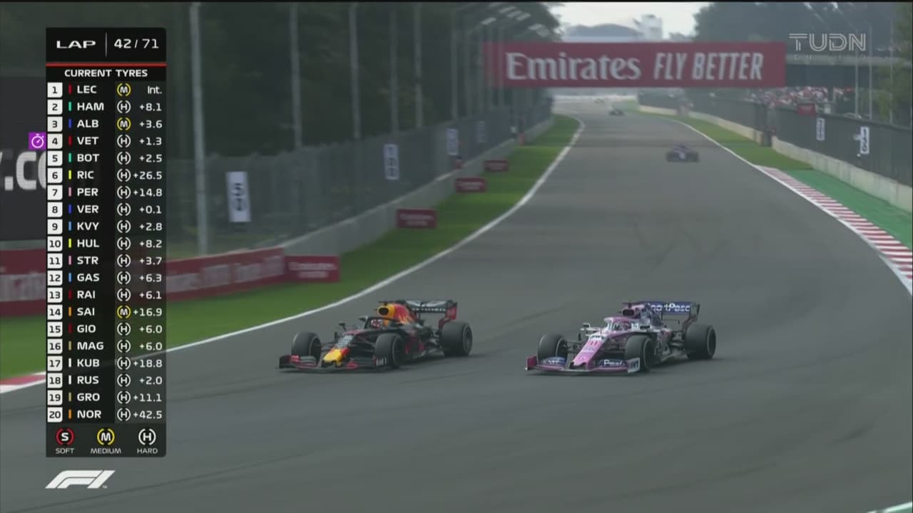 Fue a la altura de la vuelta 38 cuando Checo pasó al séptimo puesto, beneficiándose de que Lance Stroll, su compañero del equipo Racing Point, entró a zona de fosos. Pero ese séptimo puesto no le duró mucho porque en el giro 42 un Verstappen al rojo vivo, que por un momento y luego de entrar a pits en el inicio de la carrera se fue al último puesto, el 20, pero como los salmones, remontando posiciones, a contracorriente, fue que superó al mexicano para arrebatarle la séptima plaza, aunque Pérez dio pelea y no estuvo dispuesto a soltarla, pero no pudo hacer gran cosa.