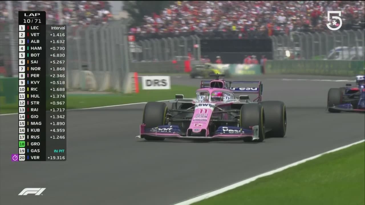 El mexicano Sergio 'Checo' Pérez del equipo Racing Point, hizo una estupenda labora al finalizar en el séptimo lugar, no sin antes soportar los constantes y agresivos embates de un Daniel Ricciardo que con su Renault estuvo cerca de superar al tapatió, pero con talento, paciencia y hasta un poco de suerte, logró puntuar en casa. Suma seis puntos correspondiente al séptimo, y llega a 43 en la clasificación, aunque se mantiene como noveno.