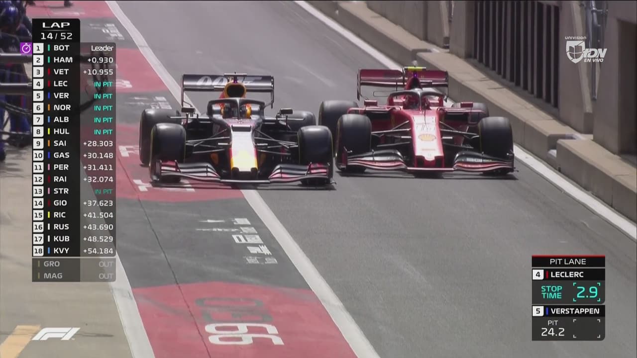 Verstappen superó a Leclerc en pits, pero el de Ferrari recuperó la posición en la pista