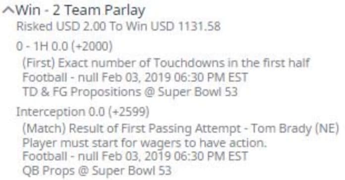 De acuerdo al bookmaker Bovada, un hombre, conocido solamente como Nate, apostó dos dólares a las siguientes dos posturas: no se anotará ningún touchdown en la primera mitad y Tom Brady será interceptado en su primer pase.