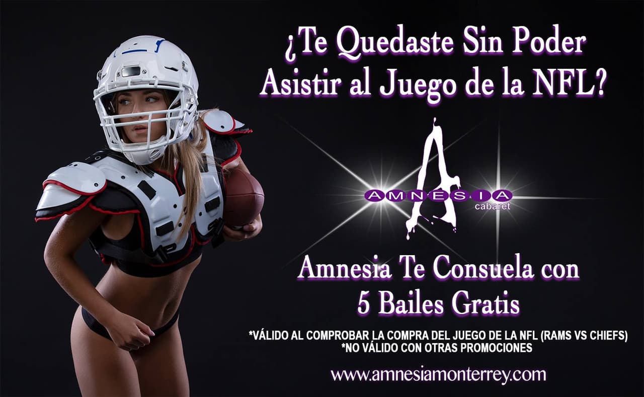 "¿Te quedaste sin poder asistir al juego de la NFL?", se lee en la publicidad del lugar. "Amnesia te consuela con cinco bailes gratis", conluye el aviso de la promoción.
